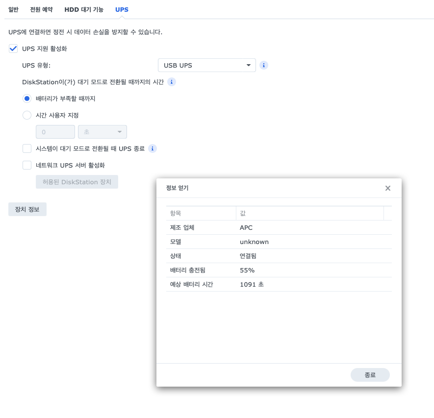 시놀로지 전원 설정으로 들어가 UPS를 활성화 시킨다