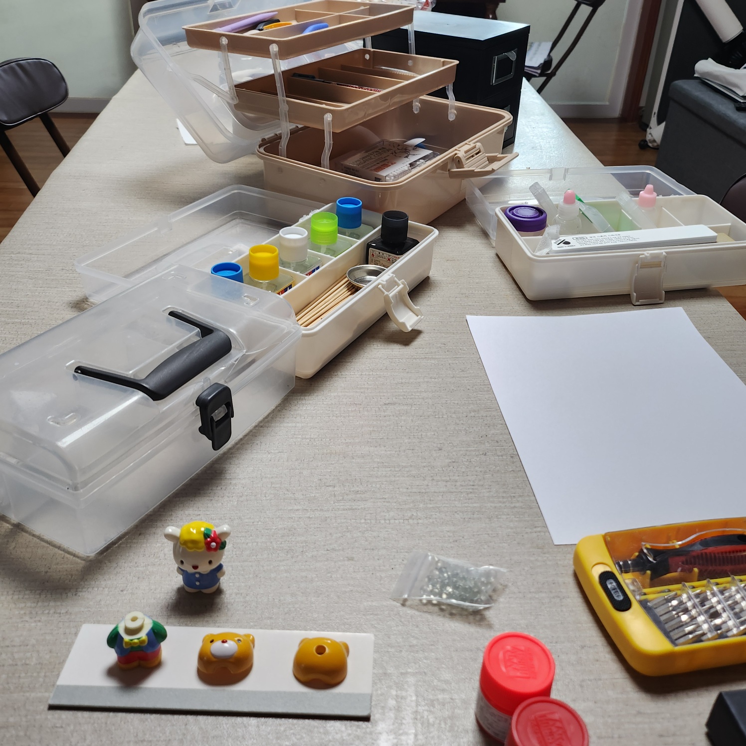 새로 구입한 도료를 잘 섞어쓰기 위해서 유리 구슬을 2개씩 퐁당한다.
