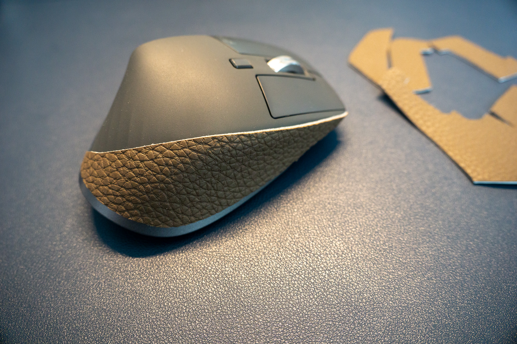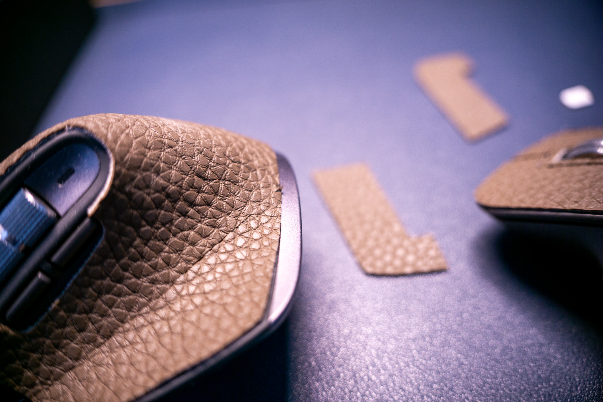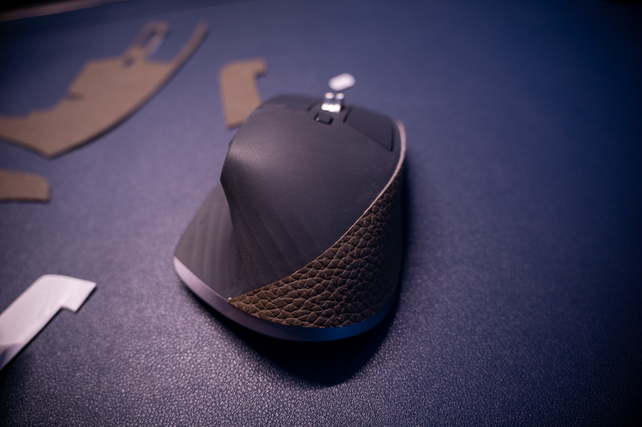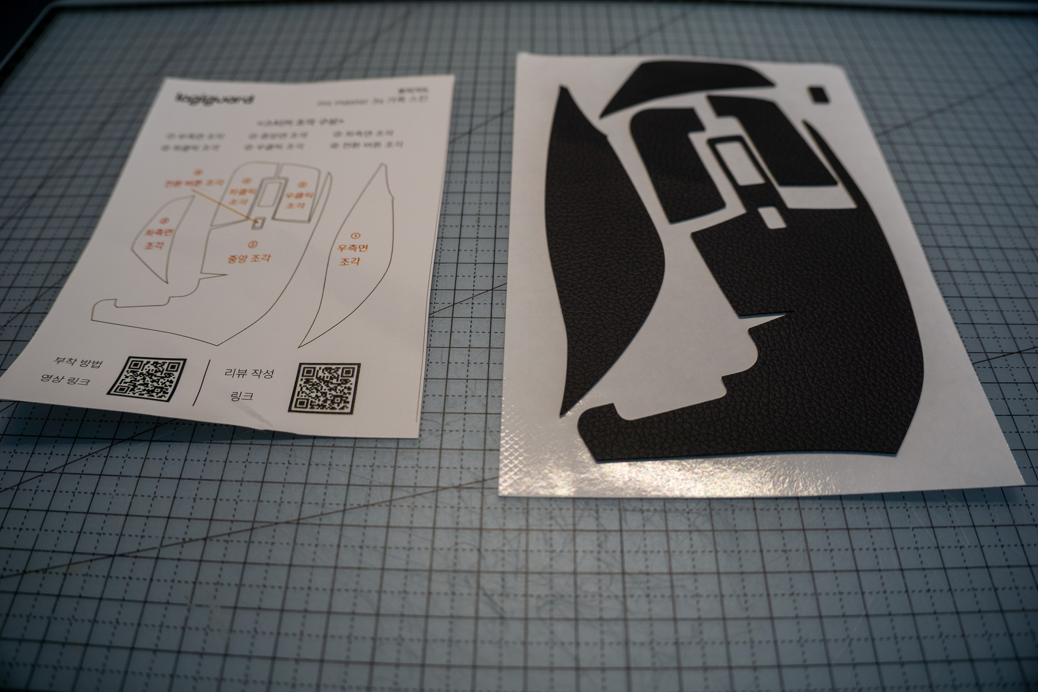 미리 재단해둔 가죽스티커를 활용하여 마우스 스킨 작업을 한다