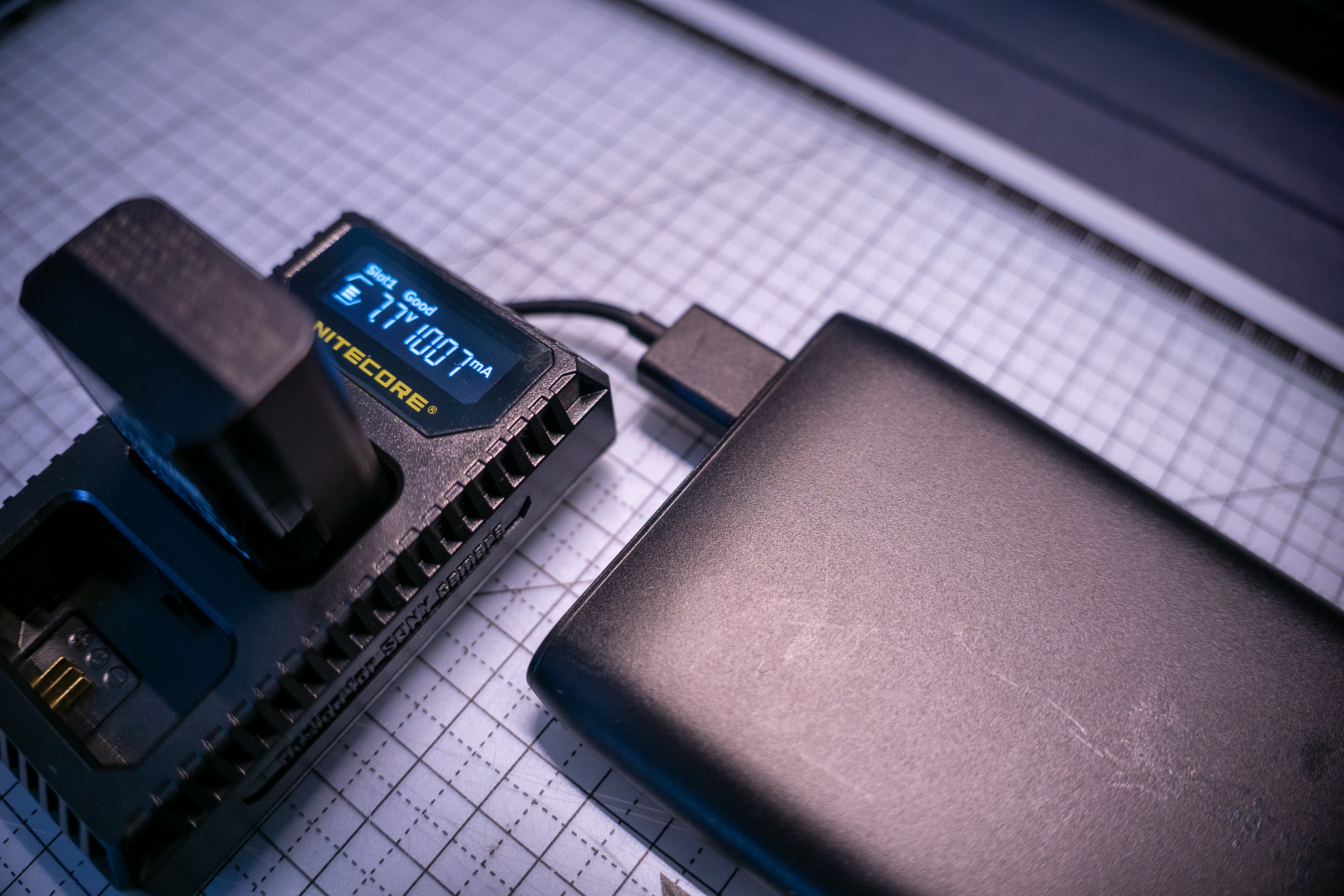 정품 배터리 2개를 번갈아 충전하며 촬영을 진행하고 있다.
